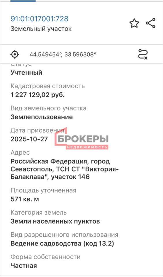 Продается участок 5,7 соток, назначение СТ, район Балаклавы. Расположен в г. Севастополь территория ТСН «СТ «Виктория-Балаклава». Участок правильной формы, ровный. Газ, свет, вода проходят по границе участка.